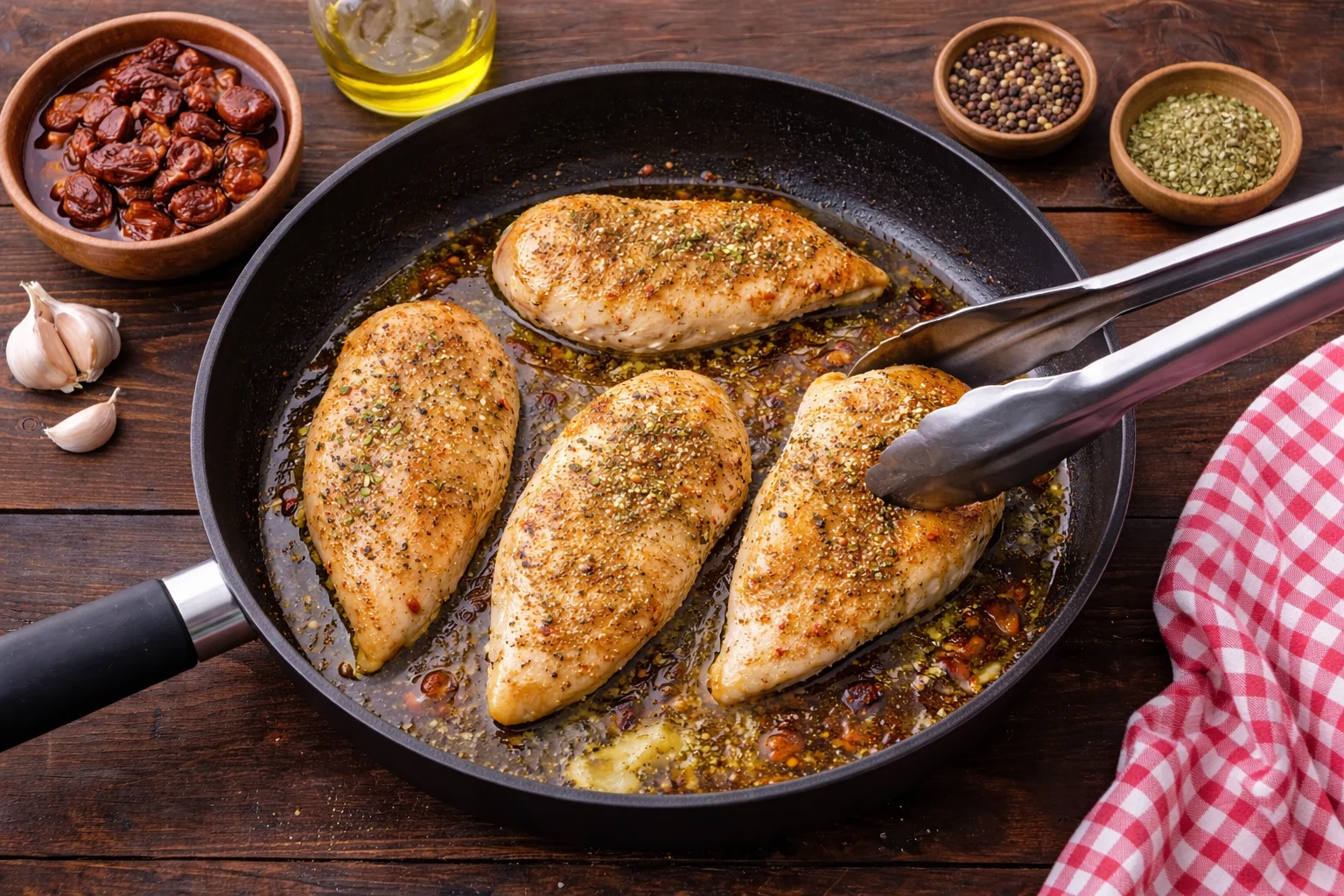 В неглубокой сковороде растапливаем 2 ст. л. сливочного масла и немного масла от томатов. Кладем грудки в сковороду, обжариваем их с каждой стороны 4-5 минут, затем убираем из сковороды.
