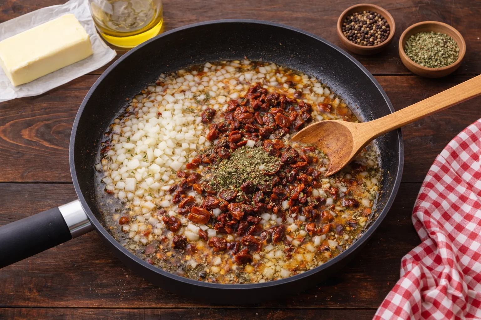 Для соуса: в эту же сковороду добавляем 1 ст. л. сливочного масла, нарезанный лук, измельченный чеснок, нарезанные томаты, 0,5 ч. л. орегано и обжариваем несколько минут.