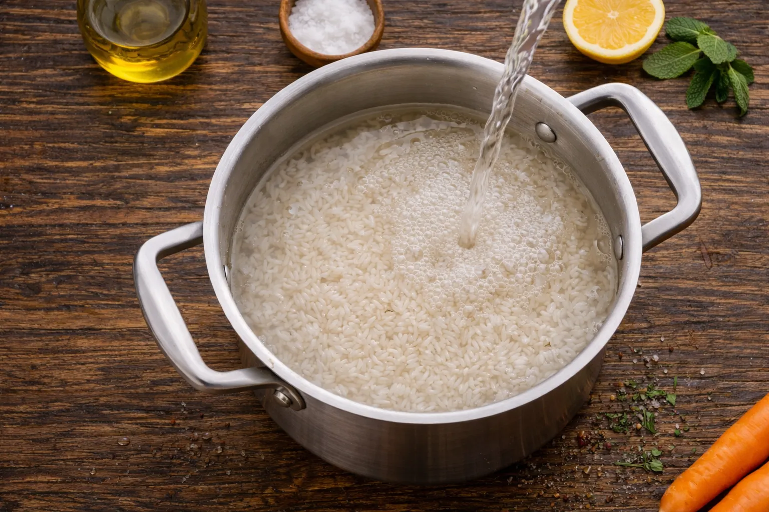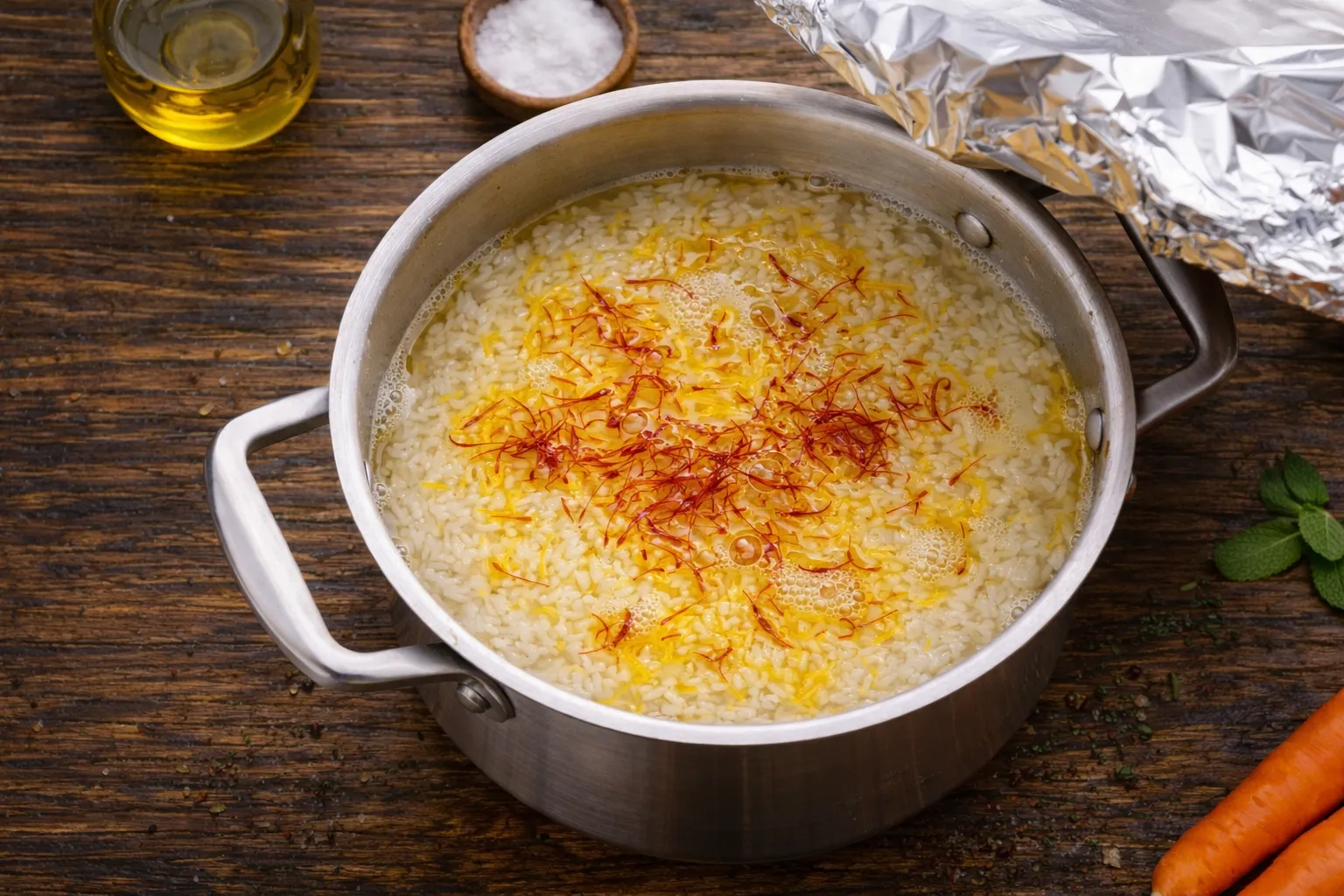 Когда рис закипит, добавьте шафран, уменьшите огонь и накройте крышкой или фольгой.