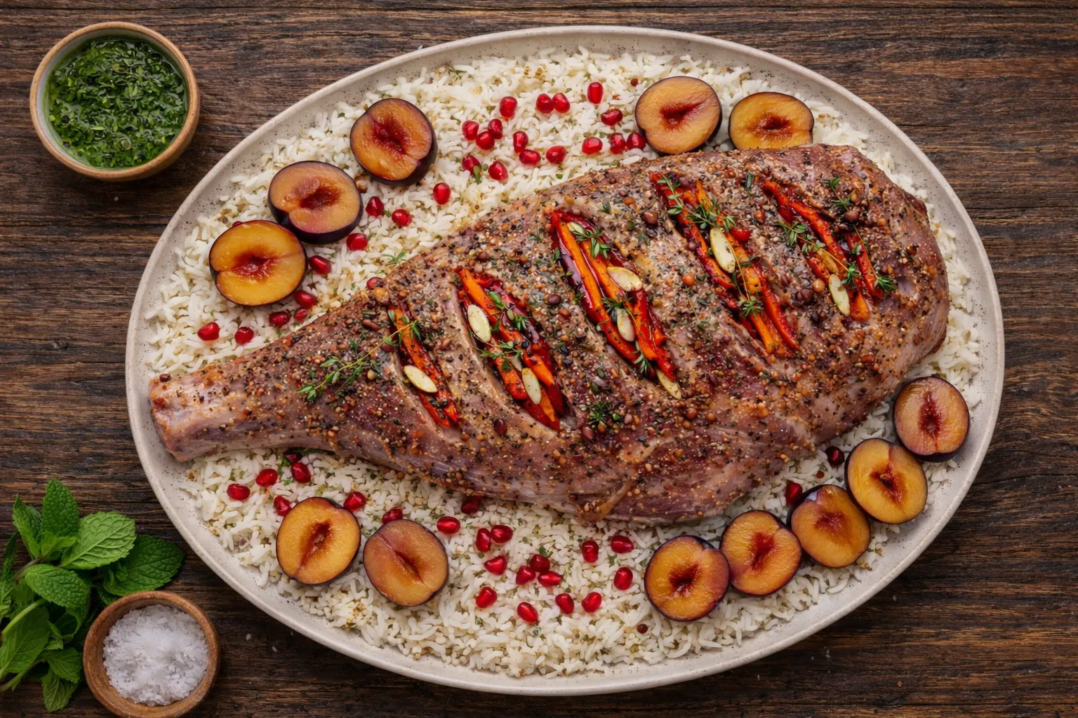 Выложите рис на большое блюдо, сверху разместите запечённую баранину. По желанию украсьте зёрнами граната. Сливы разрежьте пополам и выложите вокруг блюда для подачи.