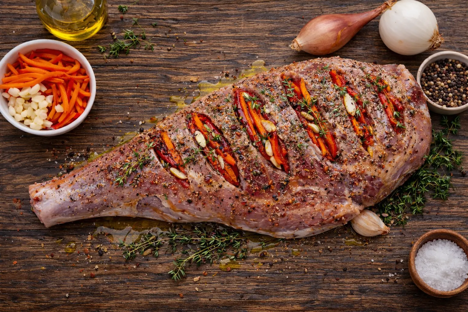 Сделайте глубокие прорези в ноге барашка. Овощи нарежьте мелкой соломкой и вложите их в прорези в мясе.