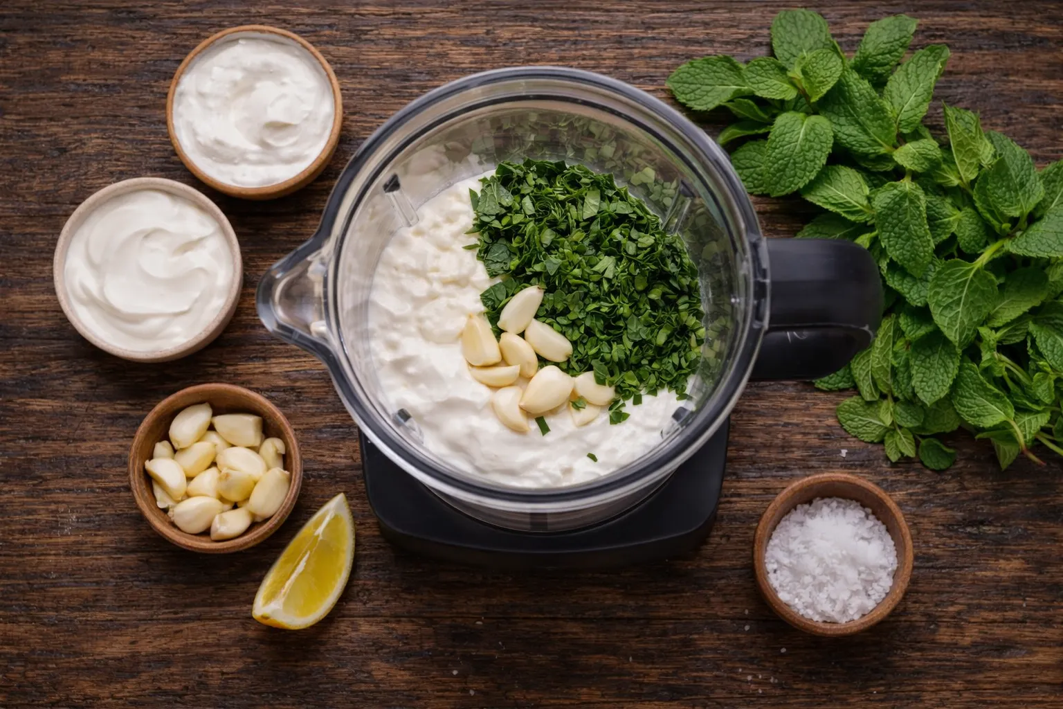 Приготовьте соус: в блендере соедините мацуни, сметану, чеснок и мяту. Измельчите до однородности. Если блендера нет — мелко нарежьте ингредиенты и хорошо перемешайте.