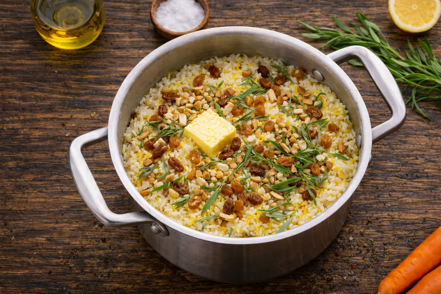 После того как рис пропарится, добавьте сливочное масло, соль, изюм, орехи и свежий тархун. Аккуратно перемешайте.