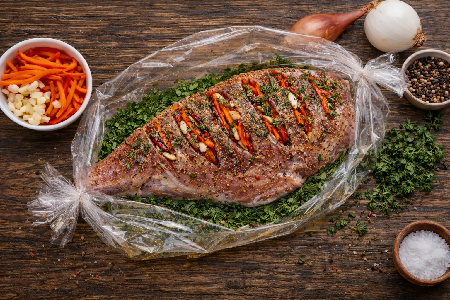 Мелко порубите всю зелень. Переложите баранину и зелень в пакет для запекания и отправьте в духовку на 2 часа при 220 °C.