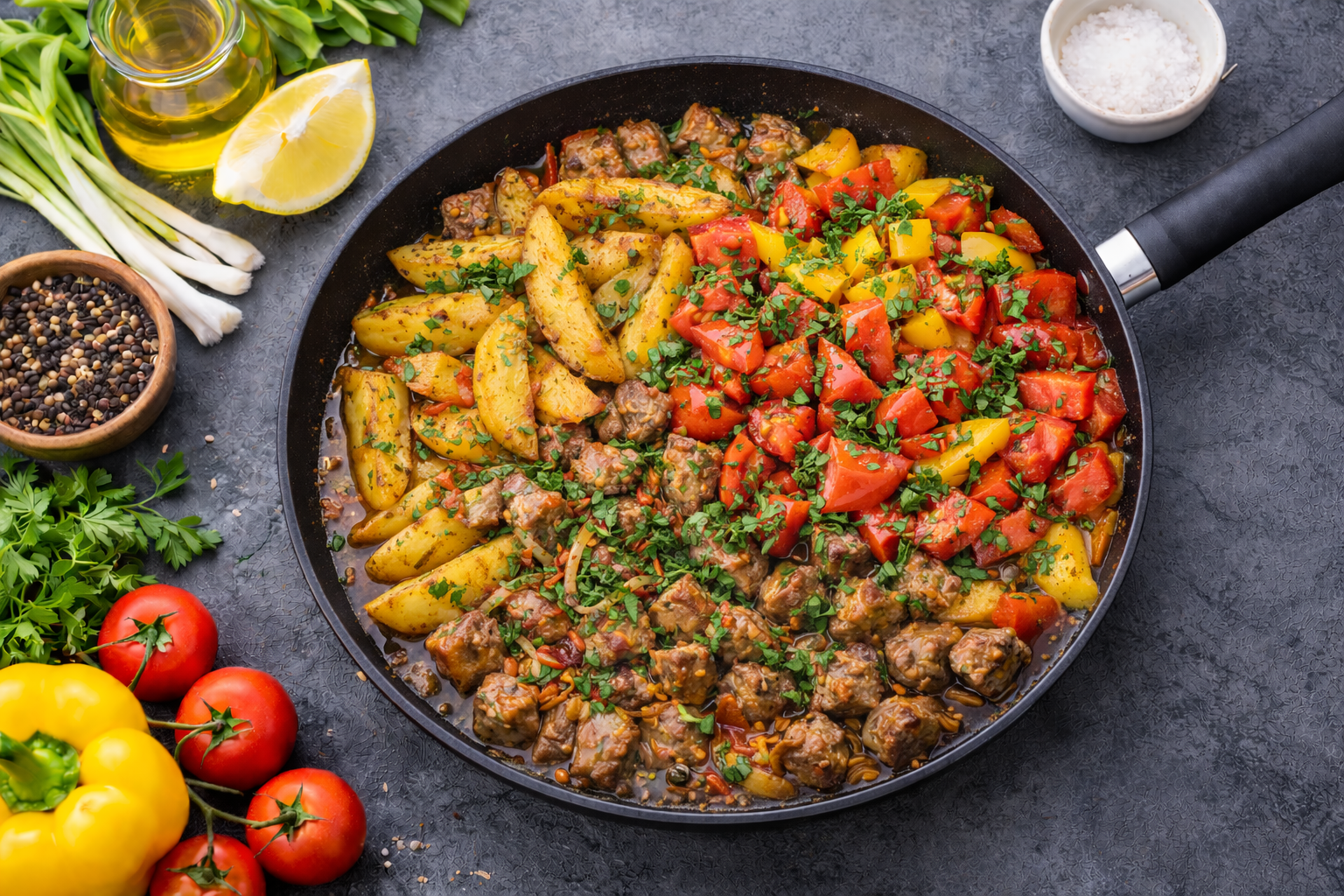 Болгарский перец и помидоры крупно нарезаем, добавляем к мясу картофель, перец и помидоры.