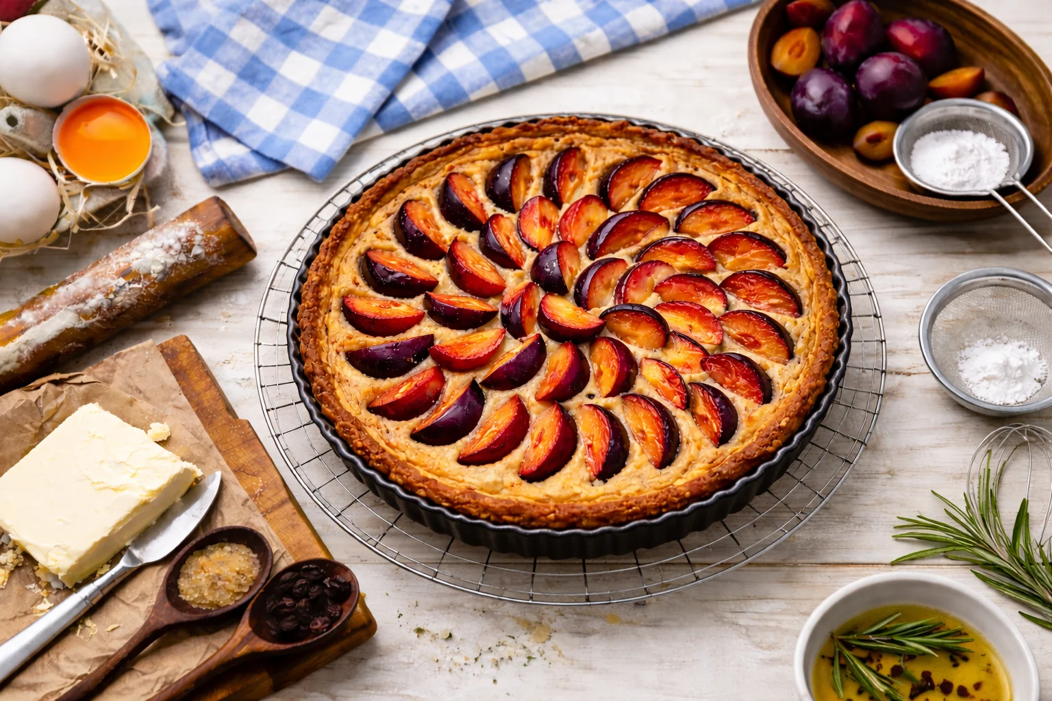 Ароматный пирог со сливами на нежном песочном тесте с миндальной ноткой и лёгким фруктовым акцентом. Сочная начинка и рассыпчатая основа делают его идеальным десертом к чаю или кофе.