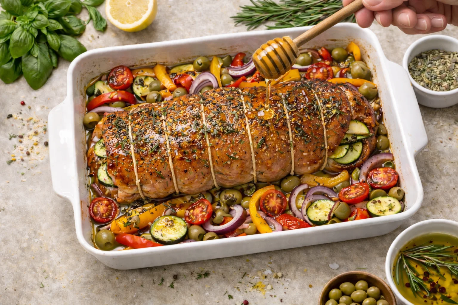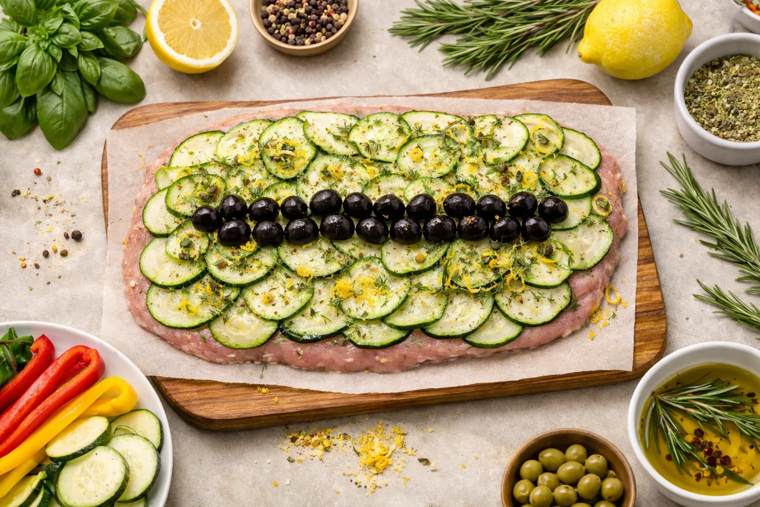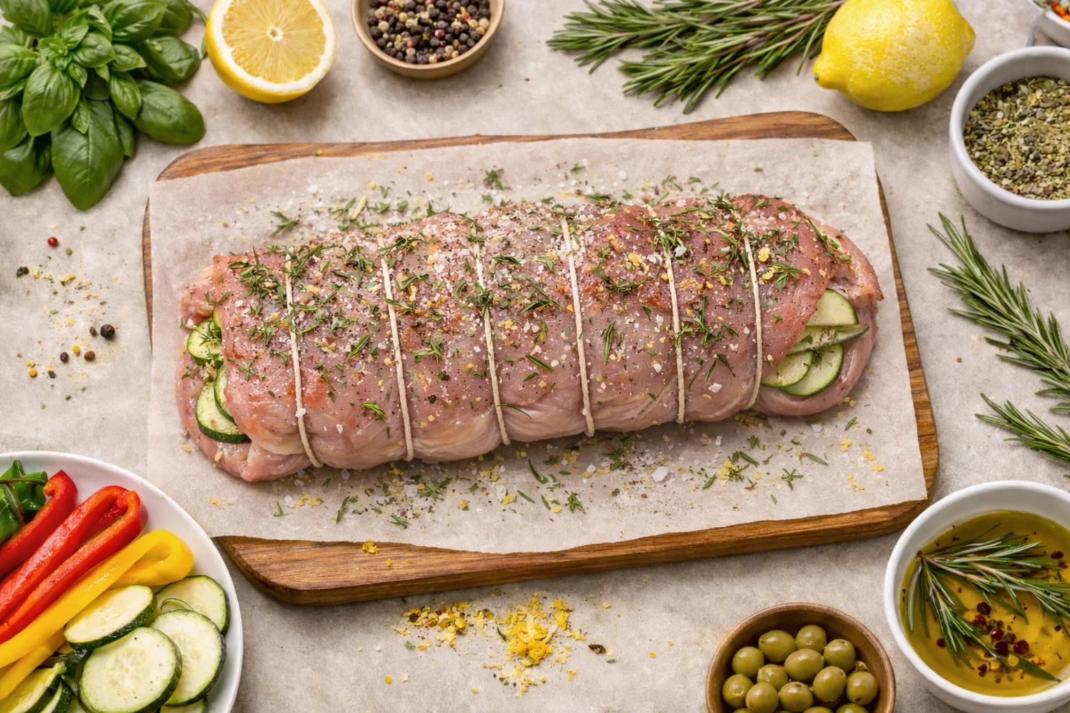 Рулет из индейки с овощами и оливками