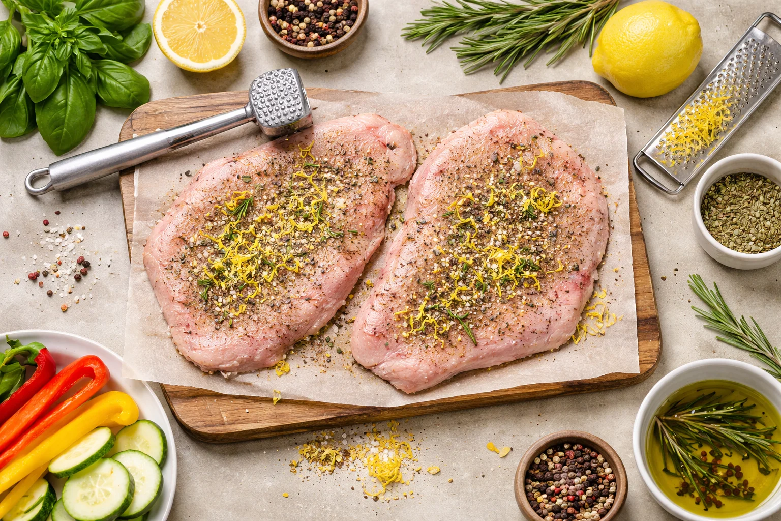 Отбейте мясо, натрите мясо солью, перцем, розмарином, тимьяном и лимонной цедрой.