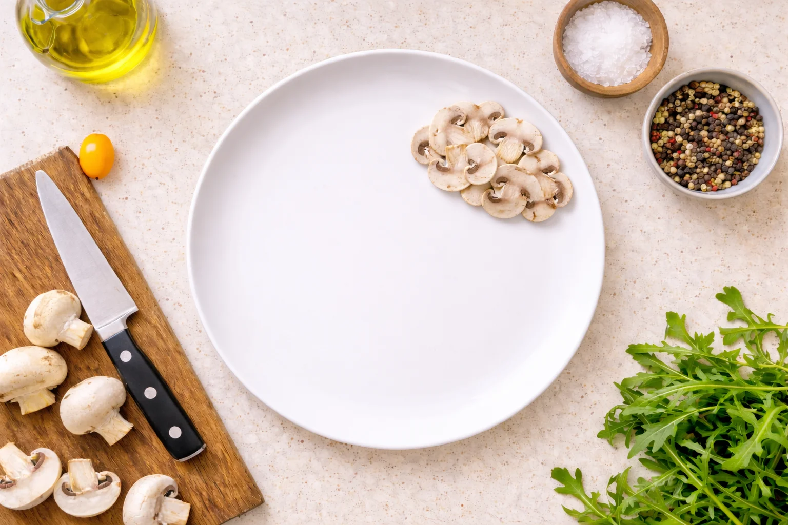 Тонко нарезать оставшиеся шампиньоны и положить в салатник.