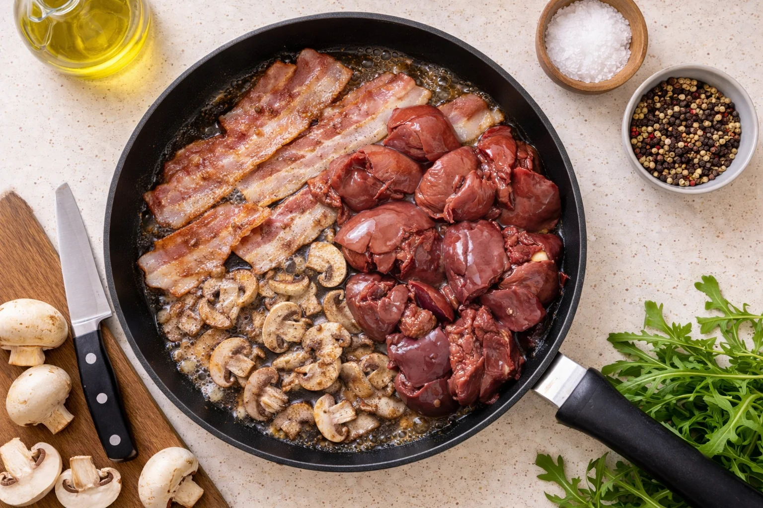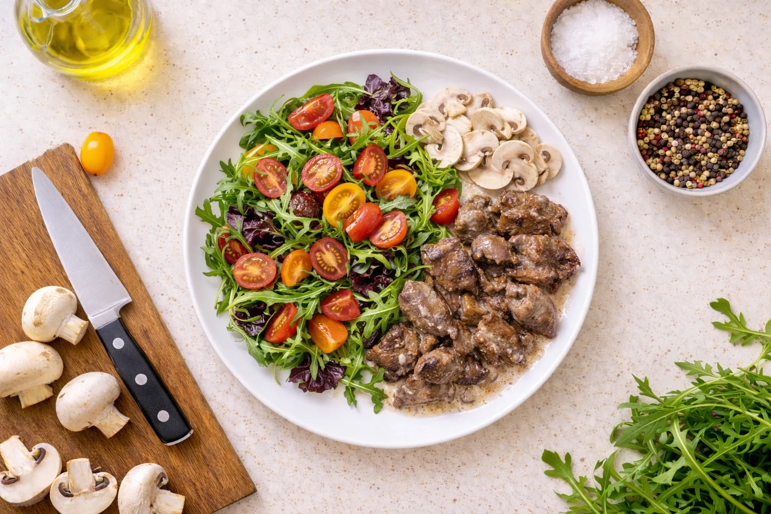 Тёплый салат с нежной куриной печенью, обжаренным беконом и шампиньонами в сливочном соусе. Сытное и сбалансированное блюдо с насыщенным вкусом, которое отлично подойдёт и для ужина, и для красивой подачи.
