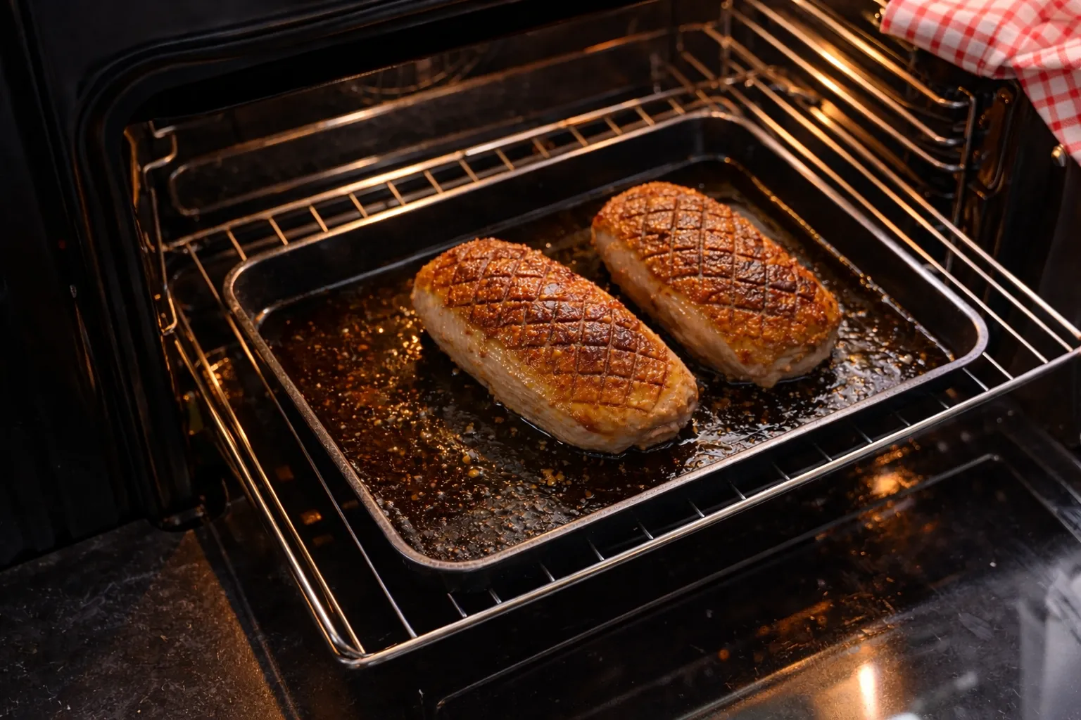 Затем переложите мясо в духовку и запекайте, чтобы утка стала ещё более сочной и ароматной.