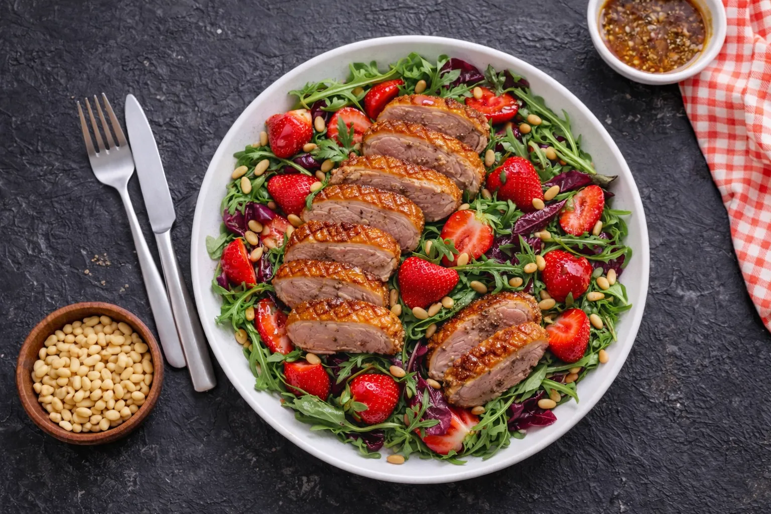 Сочетание утиного мяса с клубникой может показаться необычным, но в сочетании с салатом и орехами они создают удивительно вкусное и полезное блюдо.