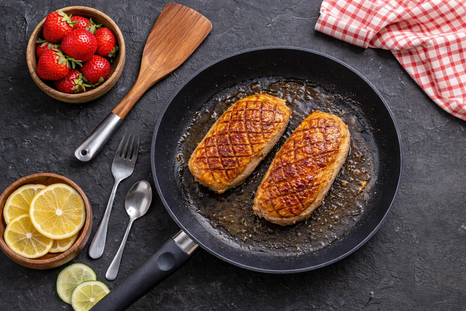 Начните с обжаривания утиной грудки на сковороде до появления золотистой корочки.