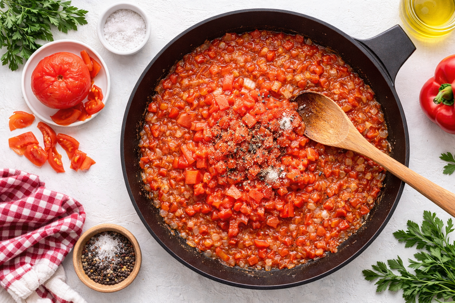 Помидор ошпариваем кипятком, снимаем кожицу и режем мелкими кубиками. Добавляем к овощам, солим, перчим и тушим еще 10-15 минут. Соус должен стать густым — это важно!