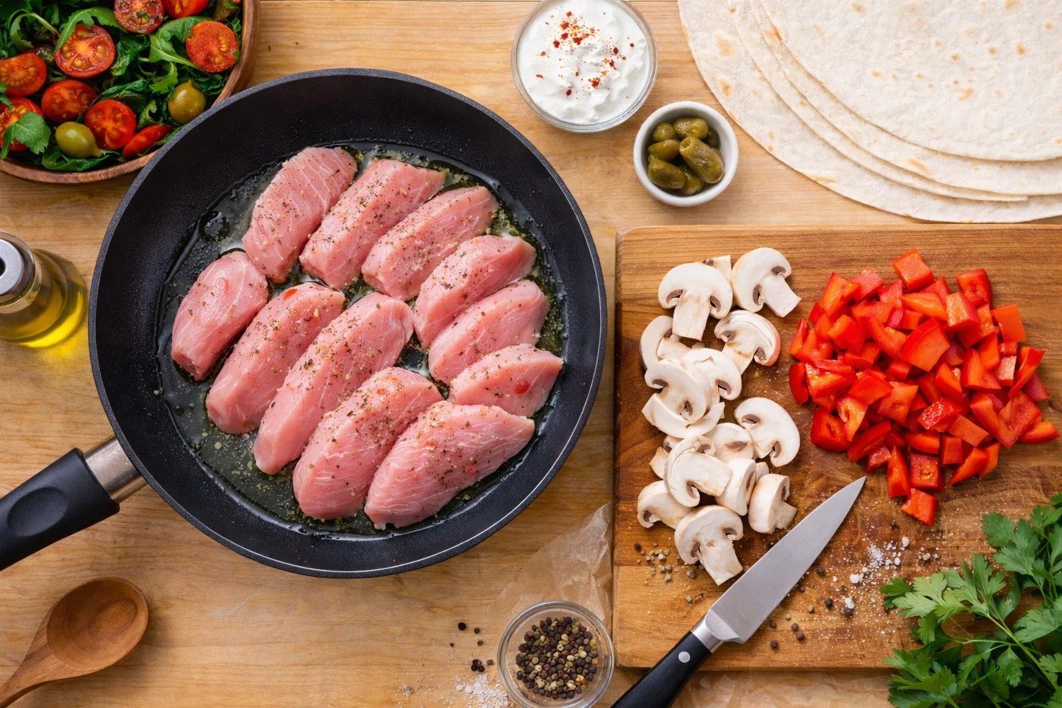 Домашняя шаурма с сочной индейкой, обжаренными овощами и нежным соусом на основе мацони. Быстрое, сытное и ароматное блюдо, которое легко приготовить на сковороде.