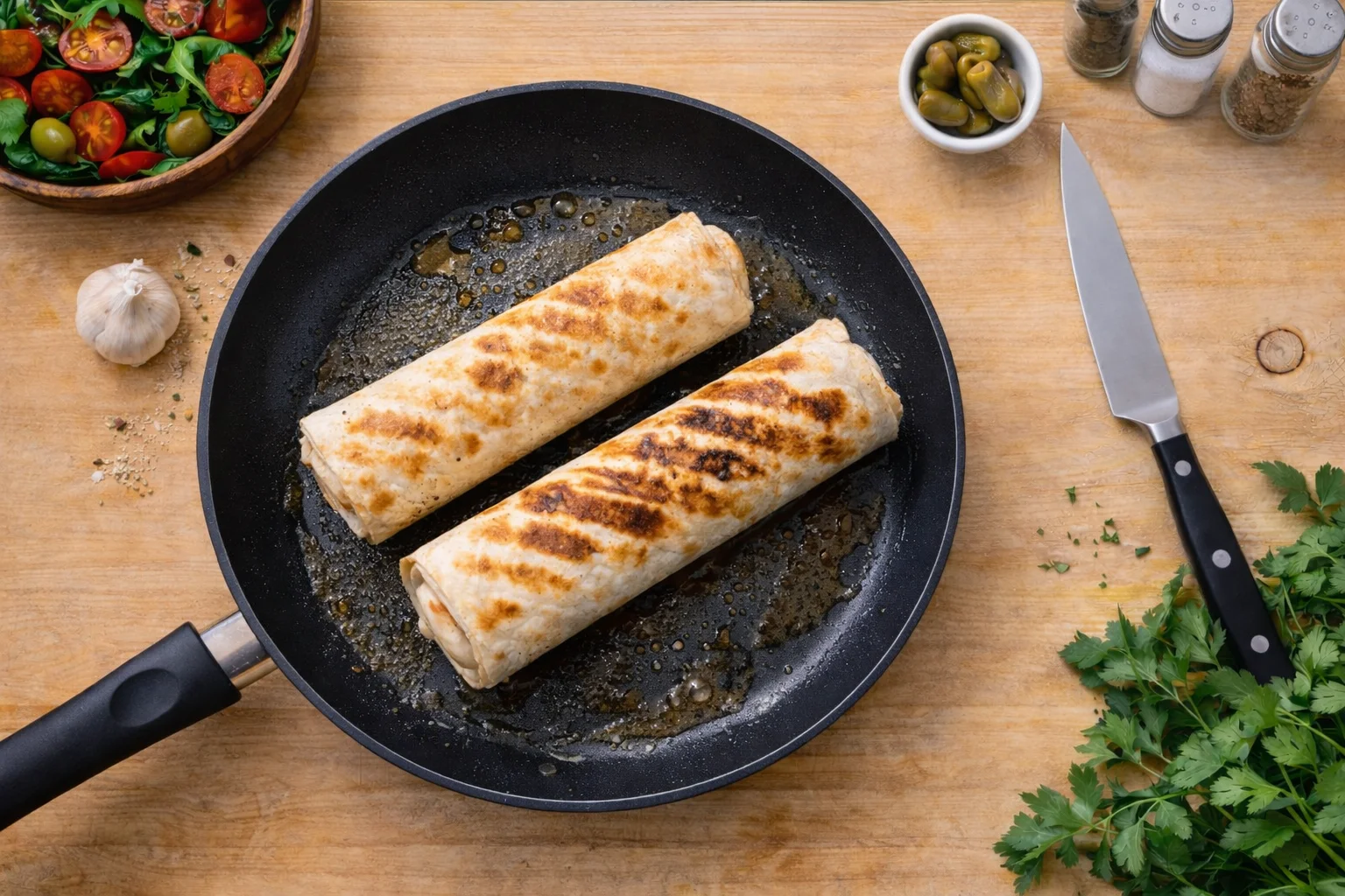 Обжарьте шаурму на сковороде по 40 секунд с каждой стороны до румяной корочки.