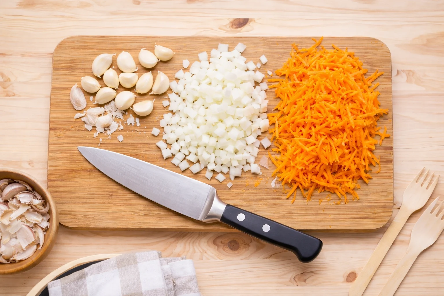 Очищаем зубчики чеснока от шелухи, нарезаем лук кубиками, а морковь натираем на терке.