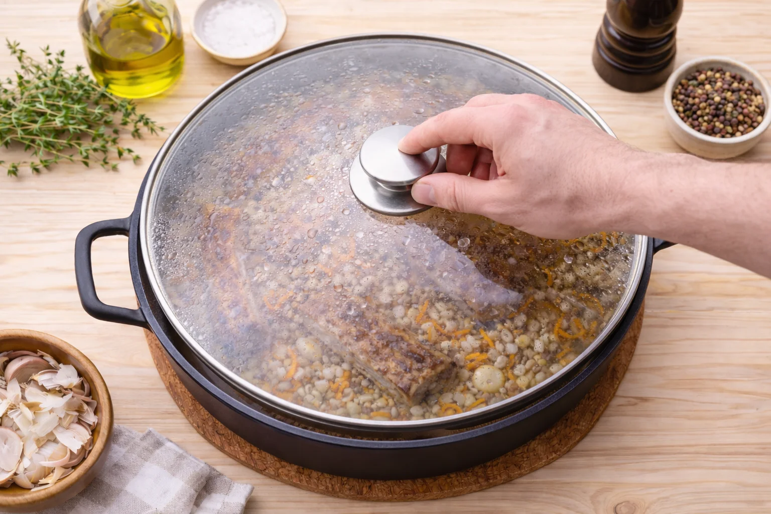 Через 20 минут добавляем овощи к ребрышкам и тушим почти до готовности.