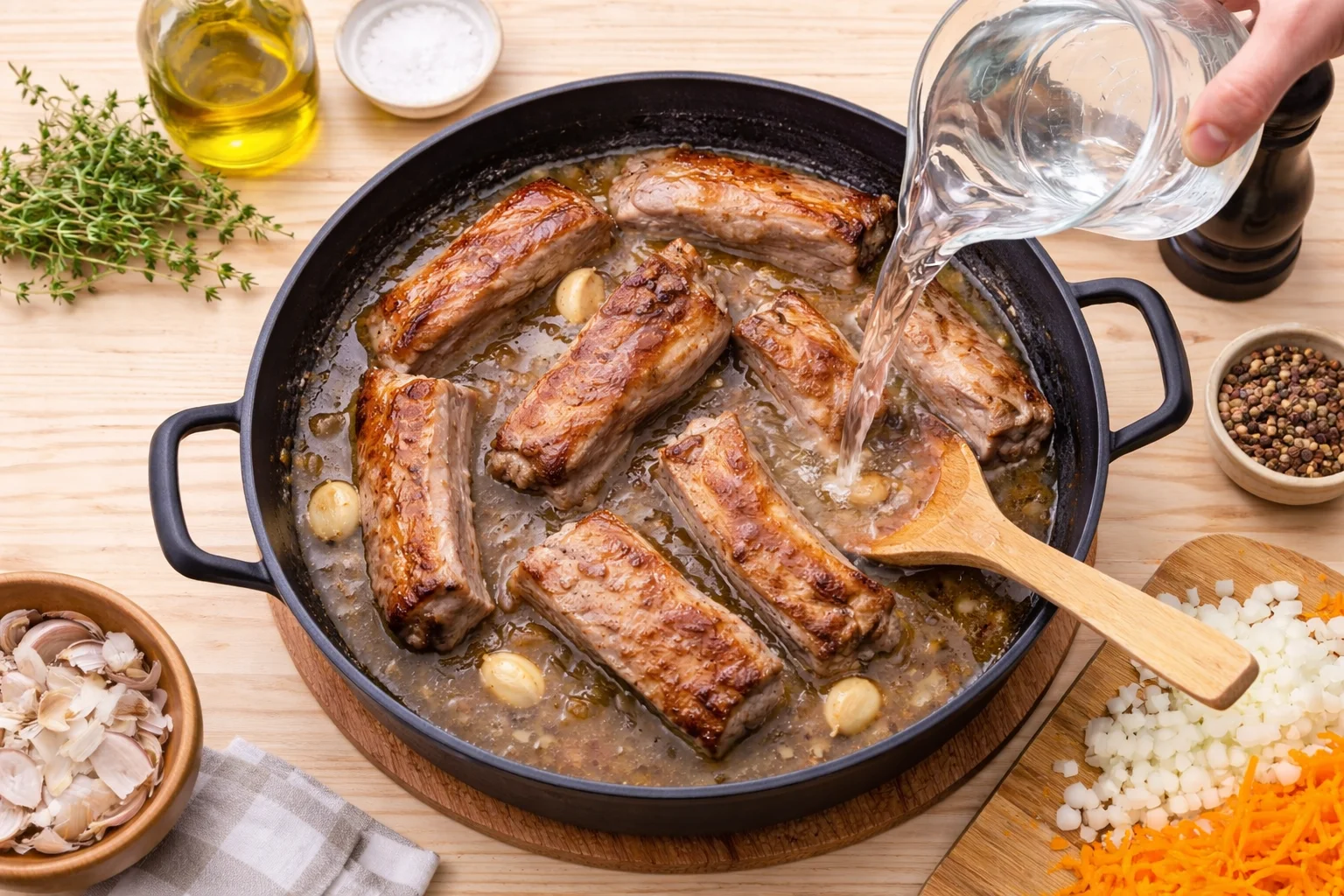 Поджариваем ребрышки на оливковом масле, добавляем воды, тушим почти до готовности.