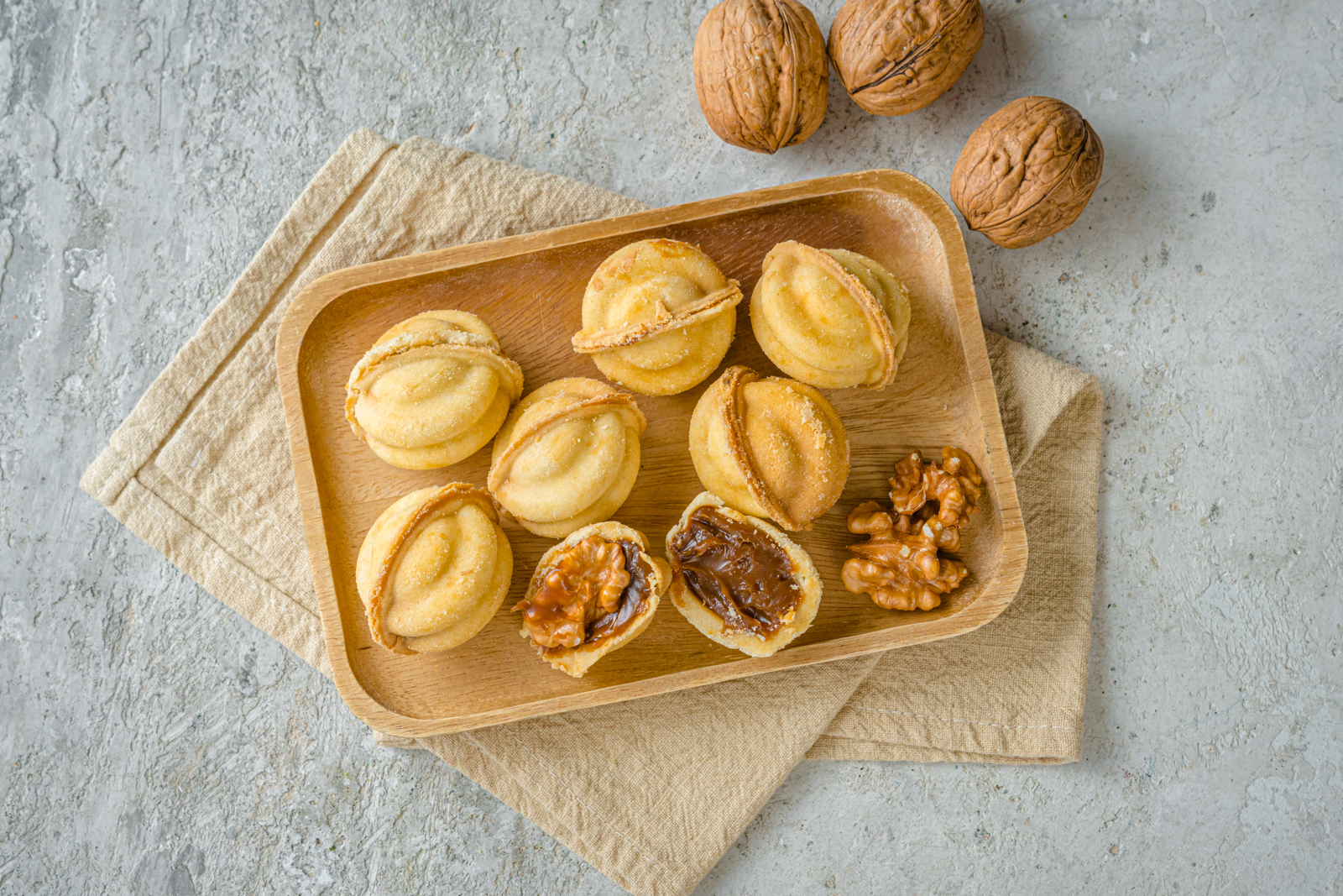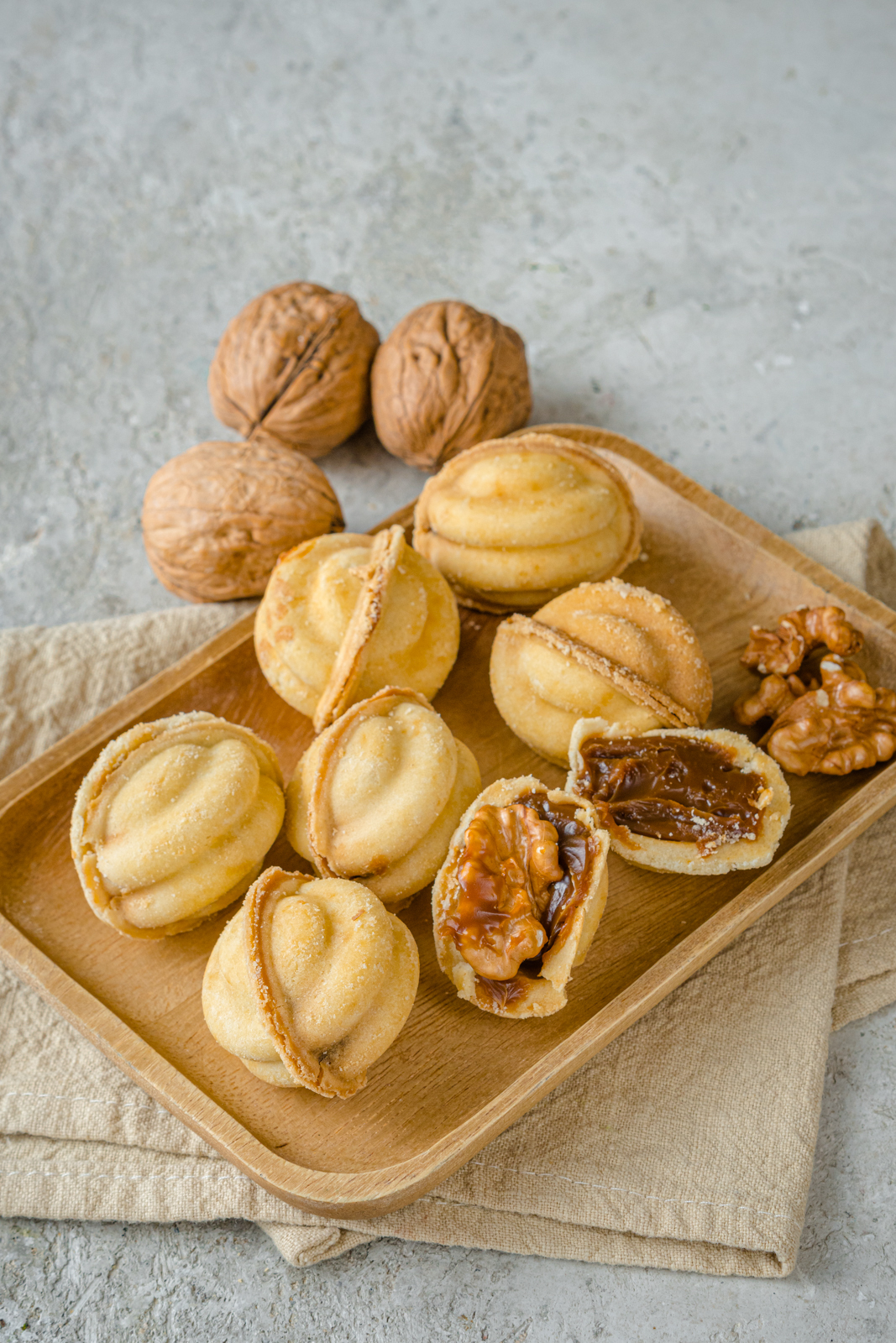 Мы бережно создаем каждый орешек: хрустящее, золотистое тесто, приготовленное по традиционному рецепту, тает во рту. Внутри вас ждет двойная награда: ароматная вареная сгущенка собственного производства, с карамельными нотками, и свежее ядро грецкого ореха, которое добавляет благородную горчинку и приятный хруст.