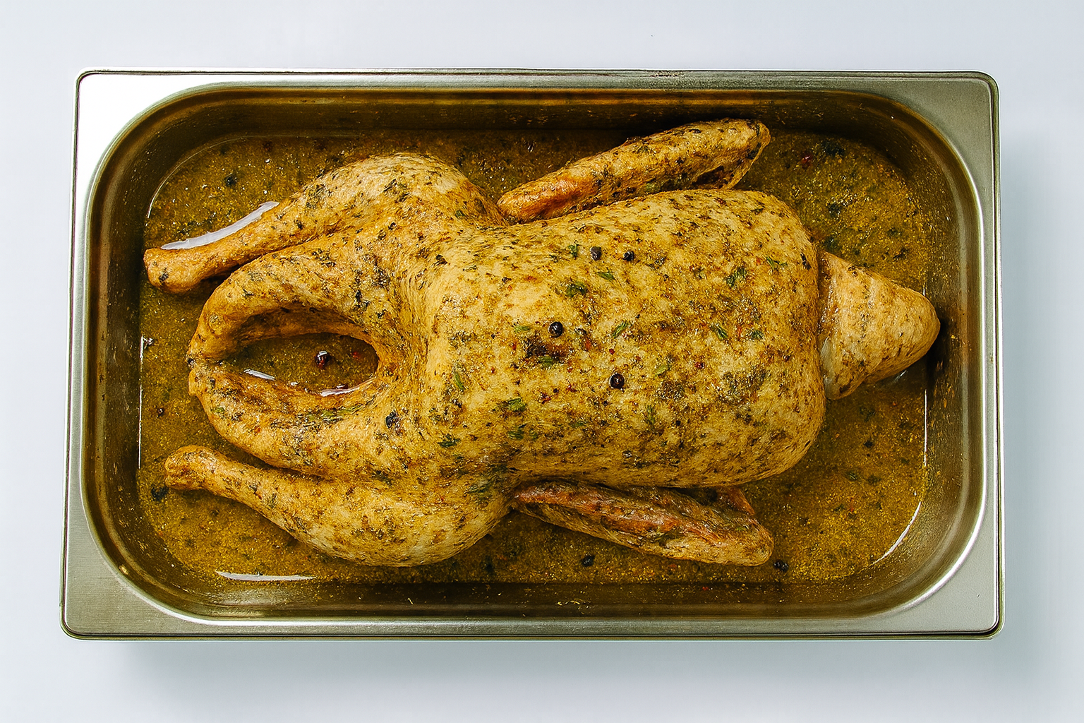 Изысканное мясное блюдо: тушка гуся в пряном маринаде на основе растительного масла с пажитником, душицей, орегано, тархуном и розмарином. Можжевеловые ягоды и чаман придают мясу выраженный аромат дичи и насыщенный вкус, который полностью раскрывается при запекании.